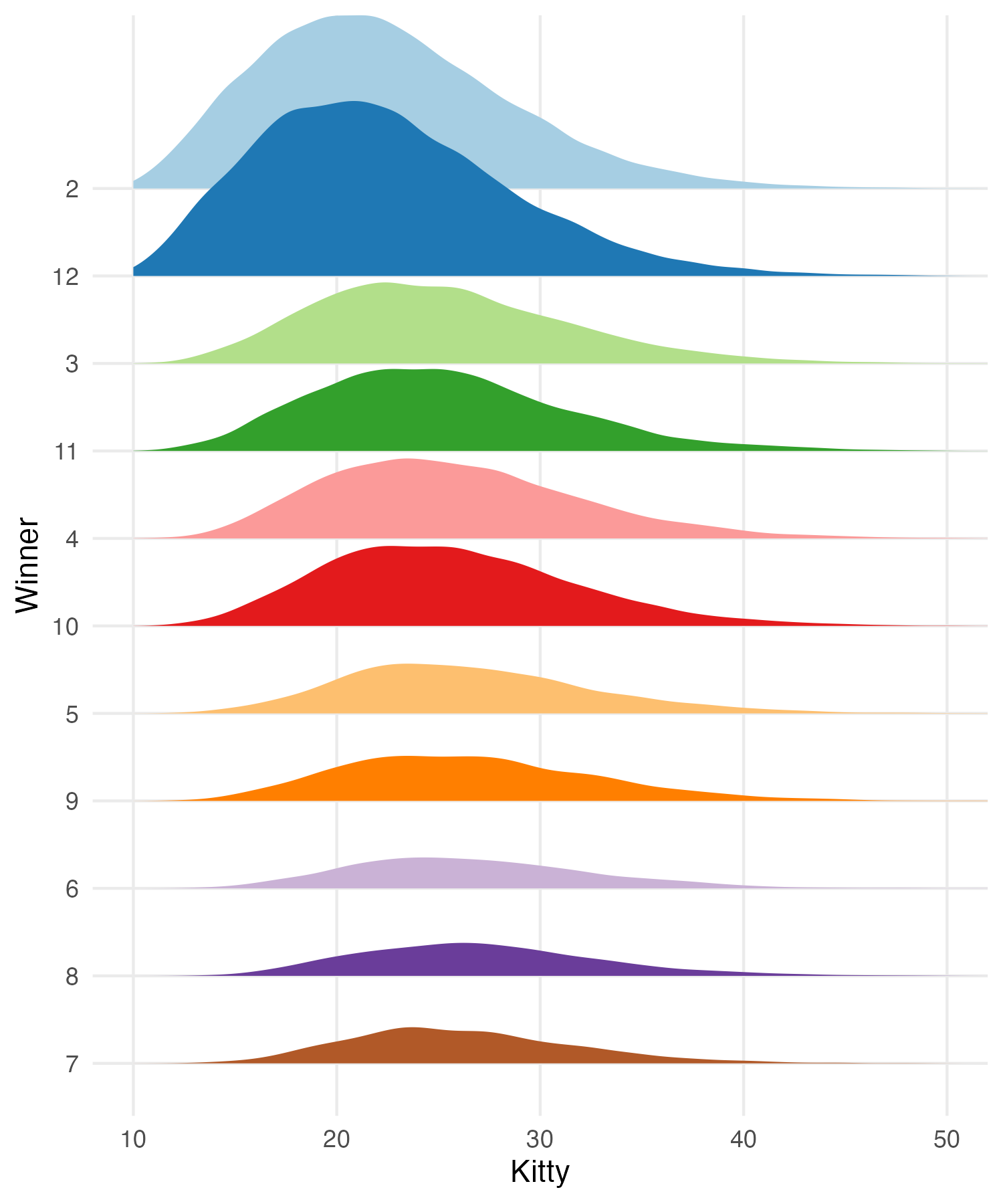 The figure below shows the kitty distribution paneled by the winning horse for those 100,000 simulated games with a base value of $0.25. The overall average kitty was $24.45 with the winner-specific averages ranging from $22.30 (12) to $26.80 (8). The kitty grows largest in games where 6/7/8 win because it takes the most steps for those horses to make it around the board.